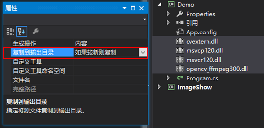 添加完成后需选中它们,然后右击设置其属性,将“复制到输出目录”属性为:如果较新则复制。