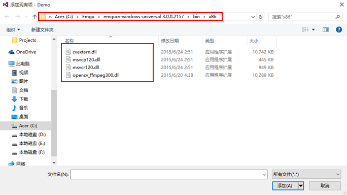 - 添加OpenCV库——从Emgu安装目录下的bin\x86(32位系统)文件夹中添加OpenCV库: