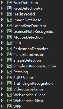 在Solution文件夹中有Visual Studio的项目文件,其中Example项目包括了Emgu的源代码和例程,这些例程包括形状检测、脸部检测、车牌检测、SURF特性匹配等非常丰富的示例,