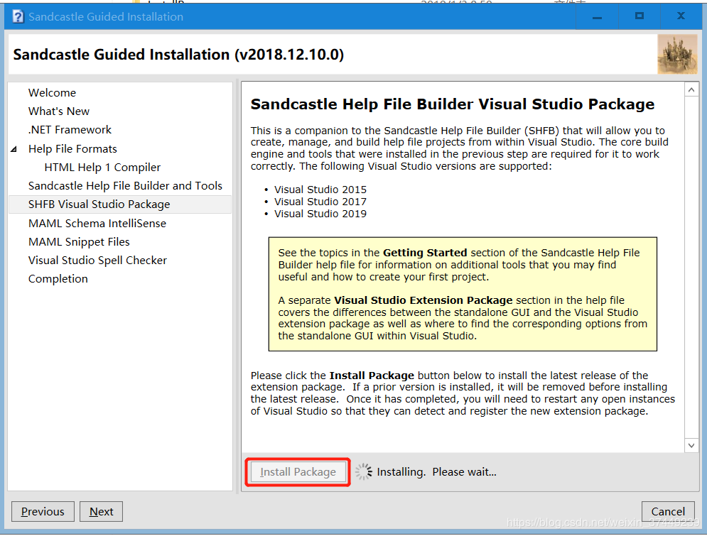2.在SHFB Visual Studio Package 栏中点击Install Package