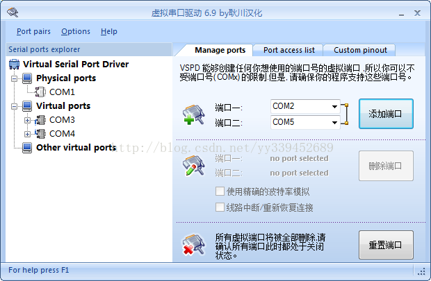 先下载一个叫Virtual Serial Port的软件,通过这个软件可以创建新的虚拟串口,如下图所示: