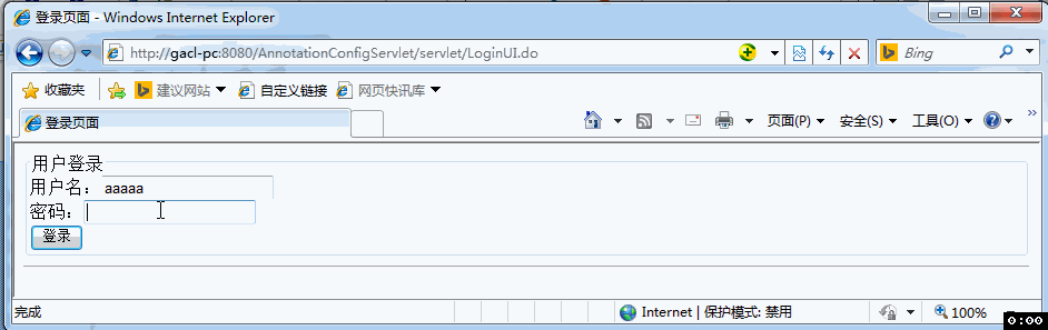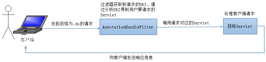 在浏览器中输入访问地址:http://gacl-pc:8080/AnnotationConfigServlet/servlet/Login.do,根据web.xml文件的配置,所有后缀名为 .do请求,都会经过AnnotationHandleFilter过滤器的doFilter方法,在doFilter方法的实现代码中,从HttpServletRequest请求对象中得到请求的方式类型(GET/POST)和请求的URI 。如有请求http://gacl-pc:8080/AnnotationConfigServlet/servlet/LoginUI.do,此时请求方法类型为GET, URI 值为/AnnotationConfigServlet/servlet/LoginUI.do。从ServletConext对象中获取到在过滤器中保存的Map结构,根据 URI 获得一个 Key=”/servlet/LoginUI” ,从 Map 结构中根据此Key得到Value ,此时Value就是要请求调用的那个Servlet类,根据Servlet类创建对象实例,再根据前面得到的请求方法类型,能决定调用此Servlet对象实例的 doGet 或 doPost 方法。最终客户端发生的后缀为.do请求,经由AnnotationHandleFilter对请求对象(HttpServletRequest)的分析,从而调用相应某Servlet的doGet或doPost方法,完成了一次客户端请求到服务器响应的过程。