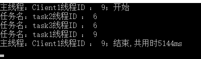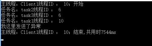 Console.WriteLine("主线程:{0}线程ID : {1};结束,共用时{2}ms", "Client1", Thread.CurrentThread.ManagedThreadId, stopWatch.ElapsedMilliseconds);