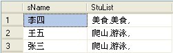 可以看到StuList列里面的数据都会多出一个逗号,这时随外层的语句:SELECT B.sName,LEFT(StuList,LEN(StuList)-1) as hobby 就是来去掉逗号,并赋予有意义的列明!