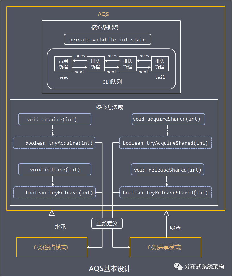 核心设计思路:AQS提供一个框架,用于实现依赖于CLH队列的阻塞锁和相关的并发同步器。子类通过实现判定是否能获取/释放资源的protect方法,AQS基于这些protect方法实现对线程的排队、唤醒的线程调度策略