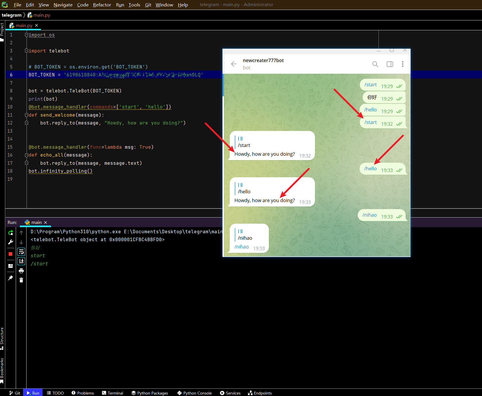 - 可以看到,自己在telegram端给这个机器人发预定义好的消息,其就会返回对应的字符串