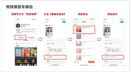 直播挂车路径:视频号主页“发起直播”—>点击【商品】—>添加商品—>选择添加商品—>添加成功