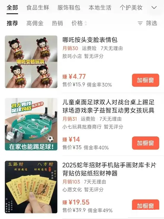 系统实时展示佣金比例:每款商品的佣金收益(如卖出一个哪吒变脸玩具,可赚取佣金4.77元)直接在商品页标注,助你快速筛选高利润品!