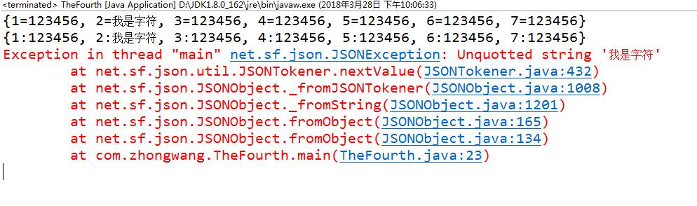 在使用了jsonObject进行json转换的时候,出现Unquotted string '我是字符'。先来看源码是怎么写的