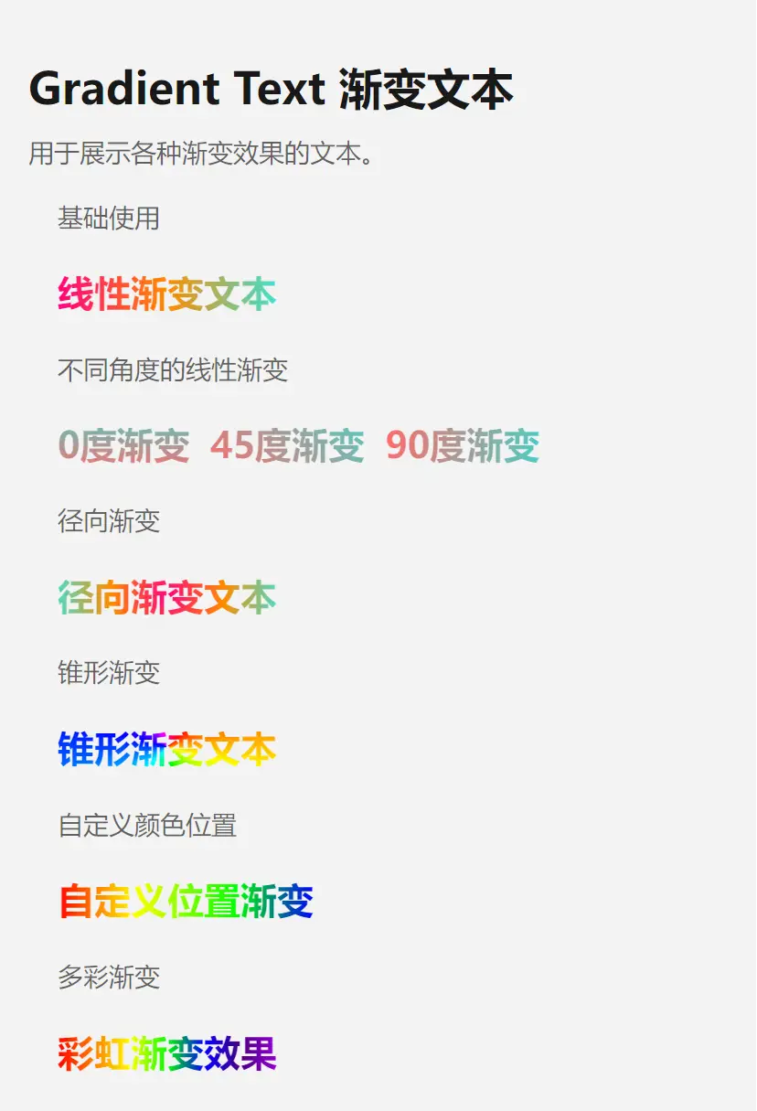 | deg | 渐变角度(0-360度),仅对linear和conic类型有效 | number | 0 | 否 |