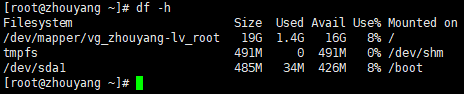 如果文件系统是xfs则执行:xfs_growfs /dev/mapper/vg_zhouyang-lv_root。