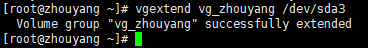 知道组就可以将刚刚创建好的PV添加到卷组中了(vgextend vg_zhouyang /dev/sda3)