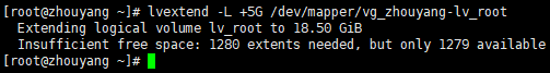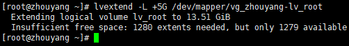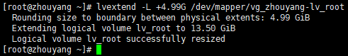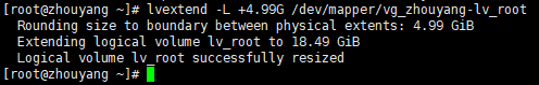 从上图可以看出可用的卷组空间大小为5G,故执行(lvextend -L +5G /dev/mapper/vg_zhouyang-lv_root)来为/dev/mapper/vg_zhouyang-lv_root增加5G的空间: