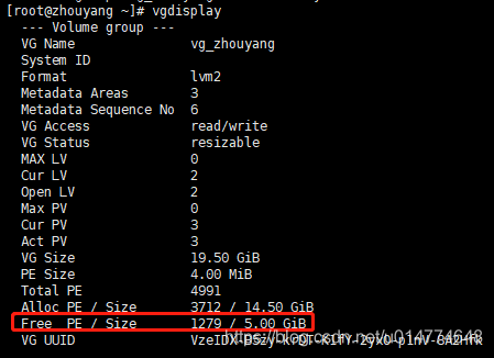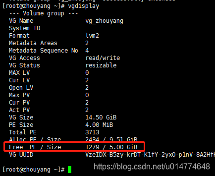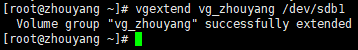 知道组就可以将刚刚创建好的PV添加到卷组中了(vgextend vg_zhouyang /dev/sdb1)