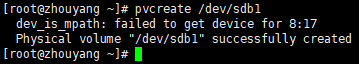 对刚刚新增的分区创建PV(pvcreate /dev/sdb1):