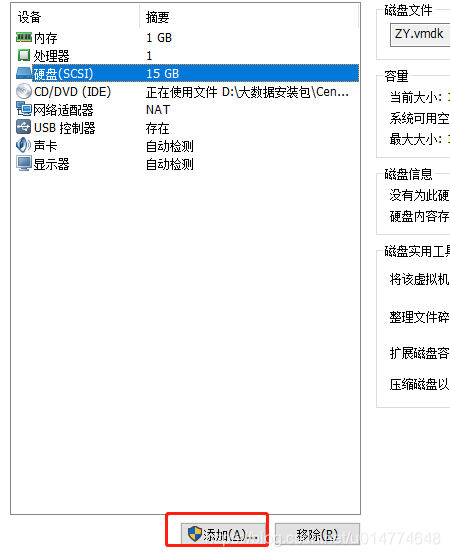 首先关闭需要添加硬盘的虚拟机,然后在VCenter中点击“添加”新增一块硬盘。