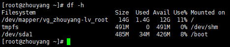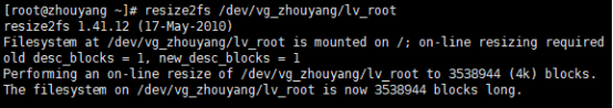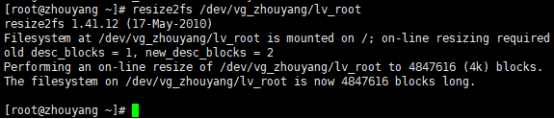 执行之后并不会立马生效需要执行(resize2fs /dev/vg_zhouyang/lv_root,命令中的vg_zhouyang是vg组名):