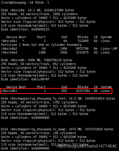 此时执行fdisk -l,就可以看到新增的分区/dev/sdb1了: