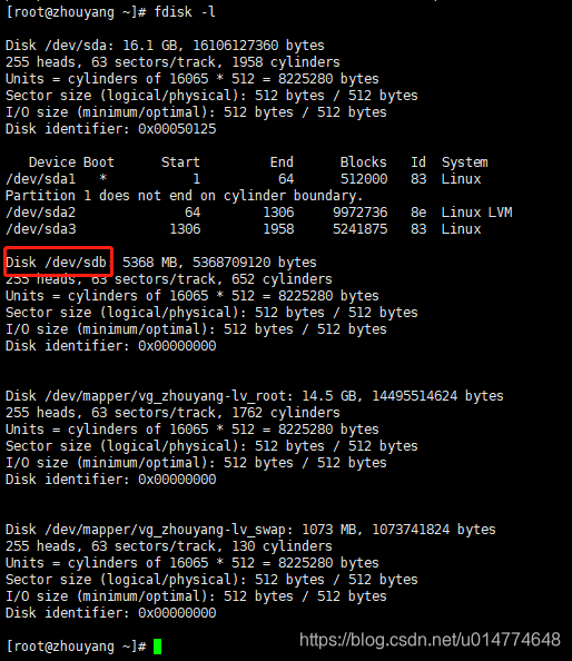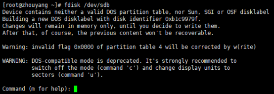 由于这里的硬盘名为/dev/sdb,所以执行命令如下:fdisk /dev/sdb(此命令根据实际硬盘名来),如下图: