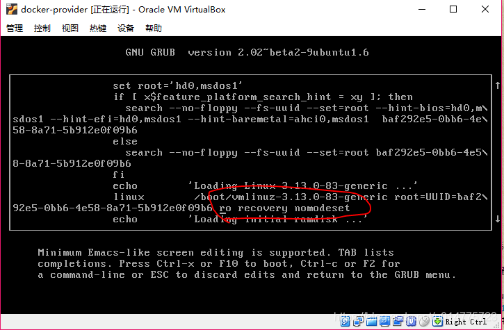 3.进入后找到ro recovery nomodeset,更改为rw single init=/bin/bash,按ctrl进入单用户模式