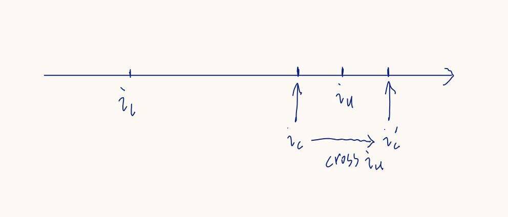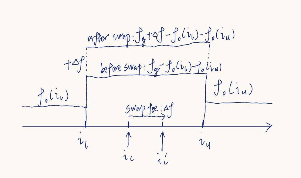 为什么是按照这个公式来更新 f o f_o fo?我们以图 3 为例进行说明。全局手续费为 f g f_g fg, i u i_u iu 外侧手续费为 f o ( i u ) f_o(i_u) fo(iu),在当前价格未穿越 i u i_u iu 仍为 i c i_c ic 前, i u i_u iu 外侧为其右边区域,此外我们也可以求得 i u i_u iu 左边区域的手续费为 f g − f o ( i u ) f_g - f_o(i_u) fg−fo(iu)。假设前几笔交易都在区间内进行,使得区间手续费增加了 Δ f \Delta{f} Δf,之前已经讨论过, i u i_u iu 未被穿越,其外侧手续费仍然为 f o ( i u ) f_o(i_u) fo(iu) 不变,只是全局手续费 f g f_g fg 变为 f g + Δ f f_g+\Delta{f} fg+Δf,计算得出 i u i_u iu 左边的手续费变为 f g + Δ f − f o ( i u ) f_g + \Delta{f} - f_o(i_u) fg+Δf−fo(iu)。随后,一笔交易使得 i c i_c ic 穿过 i u i_u iu 到达 i c ′ i_c' ic′,该笔手续费为 Δ f 2 \Delta{f}_2 Δf2,此时全局手续费 f g f_g fg 变为 f g + Δ f + Δ f 2 f_g+\Delta{f}+\Delta{f}_2 fg+Δf+Δf2, i u i_u iu 左边的手续费变为 f g + Δ f + Δ f 2 − f o ( i u ) f_g + \Delta{f}+\Delta{f}_2 - f_o(i_u) fg+Δf+Δf2−fo(iu),而此时 i u i_u iu 的左侧变为了外侧,因此: