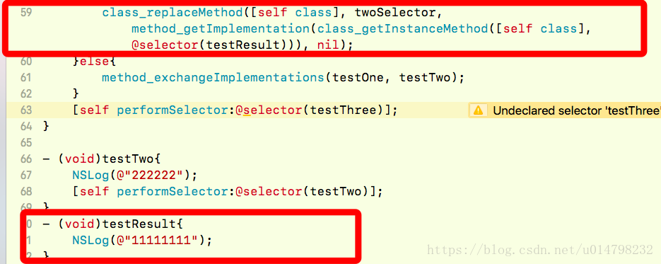 3):58行,didAddMethod表示成功,在执行class_replace方法来交换两个方法的时候,本来是想达到方法交换的效果,但是由于testOne是为nil的,所以交换并没有成功,我的理解是,这个时候testThree会调用testTwo,因为交换成功;但是testTwo交换失败,所以还是会调用testTwo