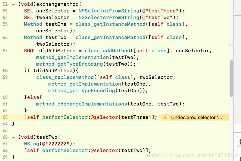 2):57行,向当前的这个类添加一个oneSelector的方法,调用oneSeletort的时候,会转为调用当前类的testTwo方法,这个就是上面class_addMethod方法的用法,不做重复说明,返回的didAddMethod为Yes,表示当前的self里面没有实现testThree方法,动态添加方法成功,也就是说再调用当前类的testThree方法的时候,会转为调用testTwo方法。