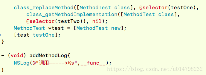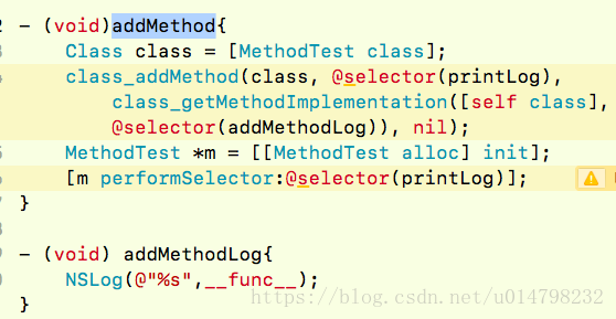 使用class_addMethod来添加实例方法,即想MethodTest添加一个printLog的方法,调用这个方法的时候,会转为调用self的实例方法addMethodLog,没有参数,由于MethodTest没有pringLog方法,要使用运行时的方法performSelector来调用,避免编译出错。