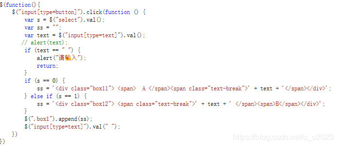 - 再来判断一下变量s,如果变量s等于0,则将'<div class="box11"> <span> A </span><span class="text-break">' + text + '</span></div>';赋值给变量ss,否则如果变量s等于1,则将'<div class="box12"> <span class="text-break">' + text + ' </span><span>B</span></div>';赋值给变量ss。