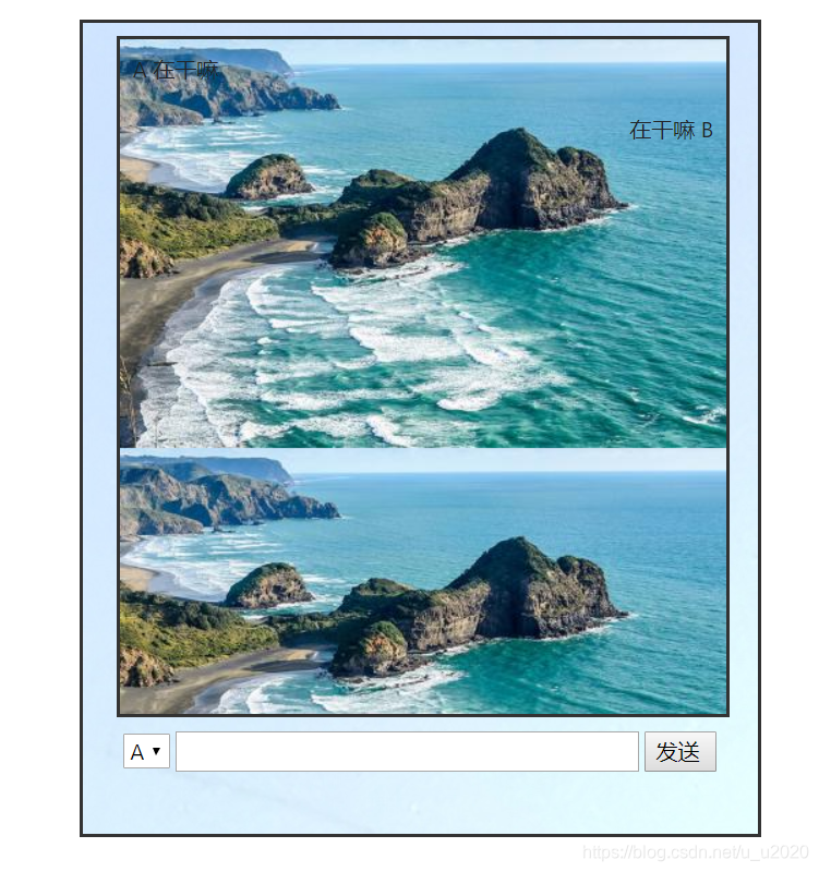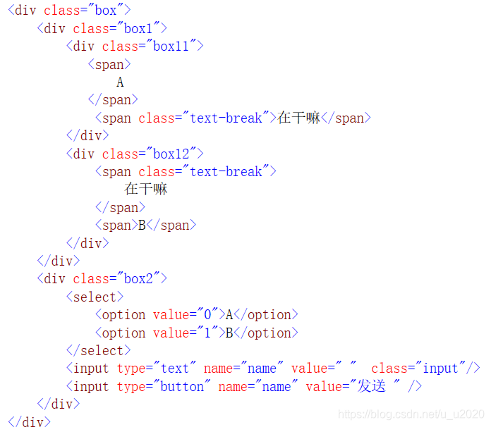 - 现在我们来写box2的布局,里面我们放一个select标签和两个input标签,select标签里面再放两个option标签,并且他们的value值分别为0,1,文本分别为A,B,第一个inpu标签给他一个类为input,并且设置一下它的宽,设置为340px,第二个input标签让它的type值为button并且它的value值为发送。