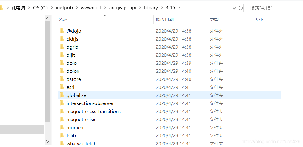 将ArcGIS API for JavaScript库全部复制到Web服务器目录(C:\Inetpub\wwwroot\arcgis_js_api\library\4.15\)