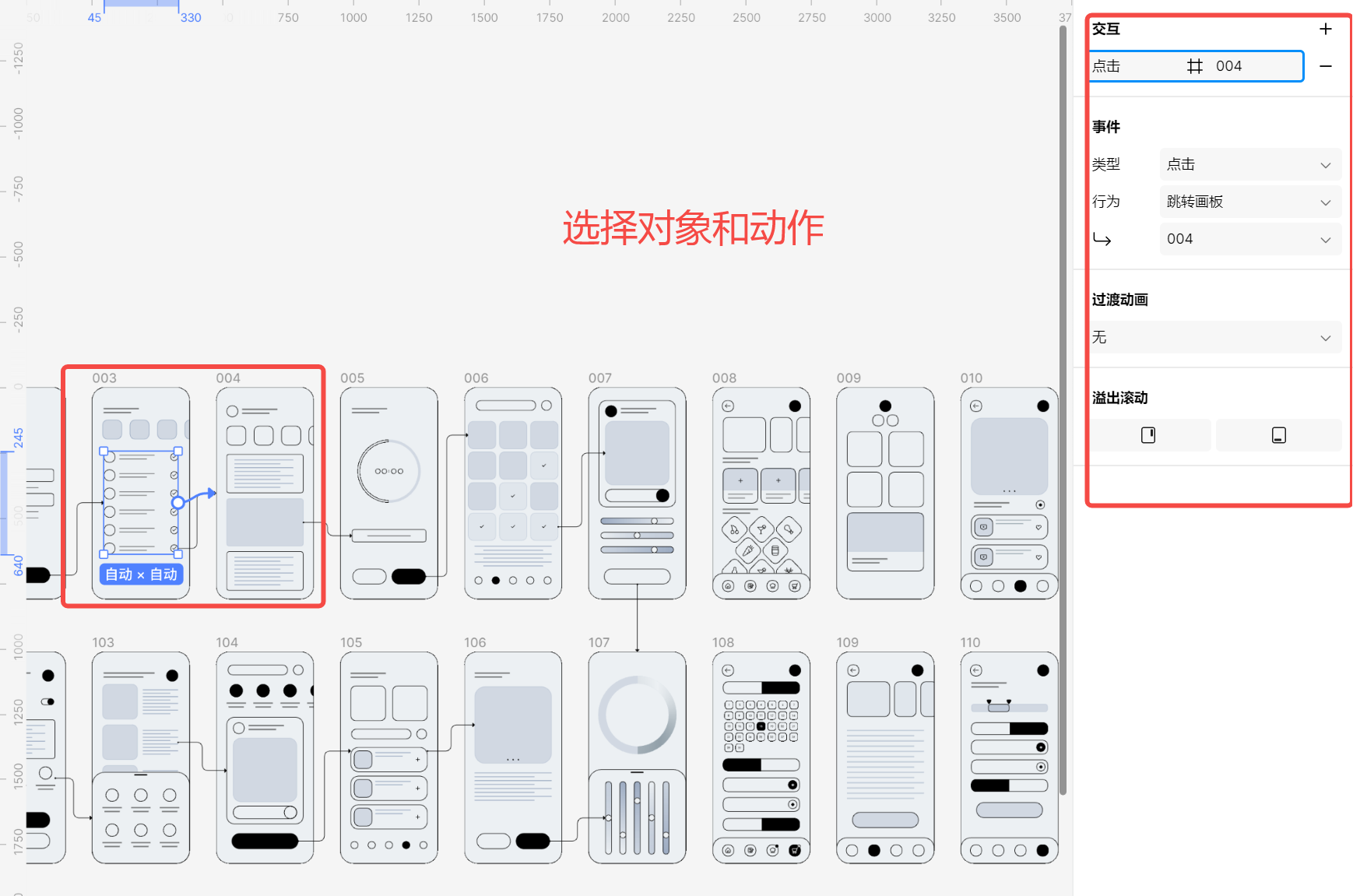 设置目标时,最好结合用户使用路径。例如,如果用户在点击按钮后需要返回首页,就应直接将目标界面设置为首页画板,而不是先跳到一个过渡页面,这样既减少了操作步骤,也让原型动效更高效直观。