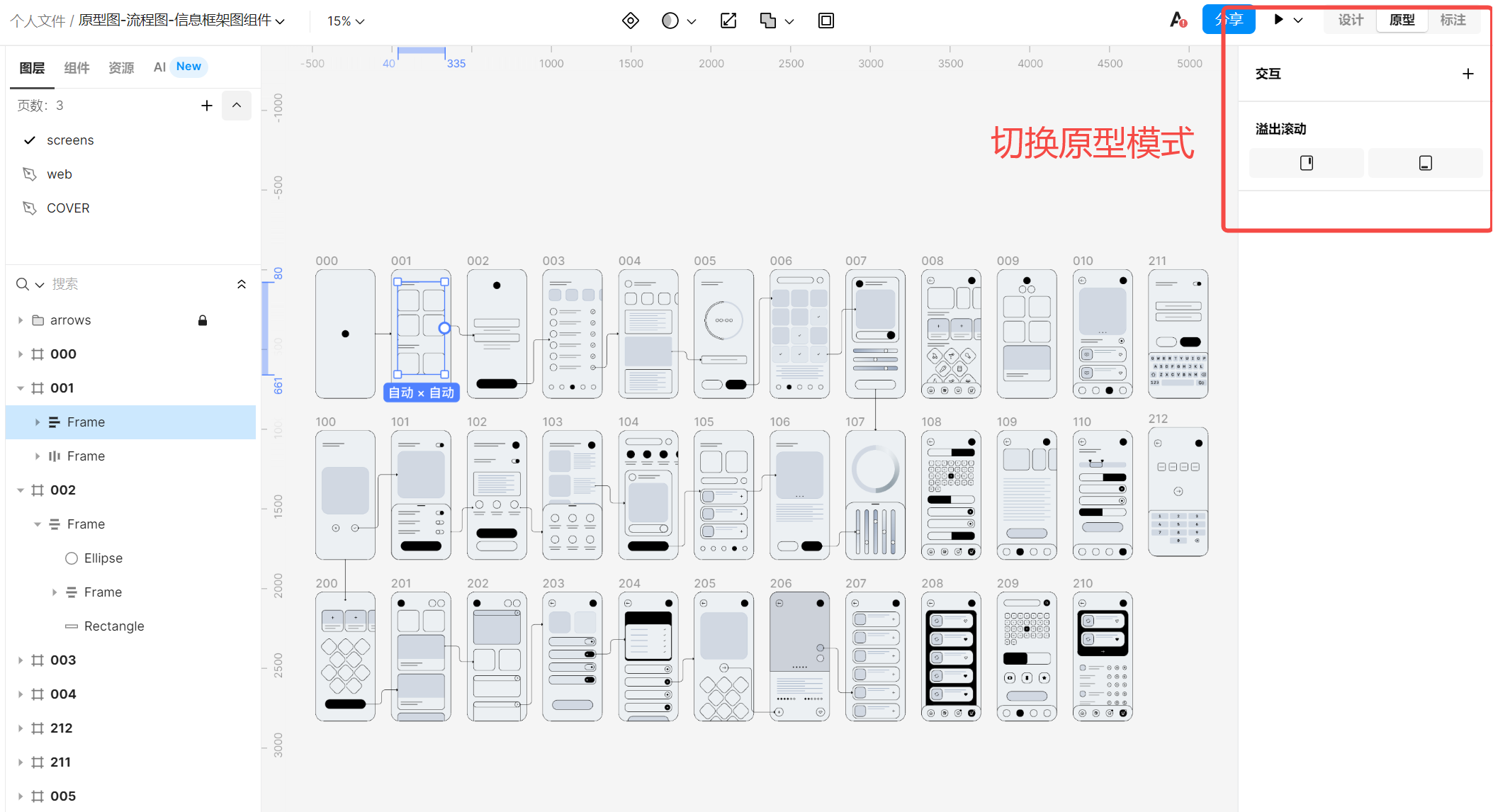 进入原型模式后,设计师可以从整体页面结构入手,先建立主要画板之间的关系,再逐步补充细节交互。这一步建议先画出交互流程图,明确各页面的跳转逻辑和可能的分支路径,再用工具中的连线功能完成布局。这样不仅能让原型动效的结构更清晰,也方便后续进行批量调整。