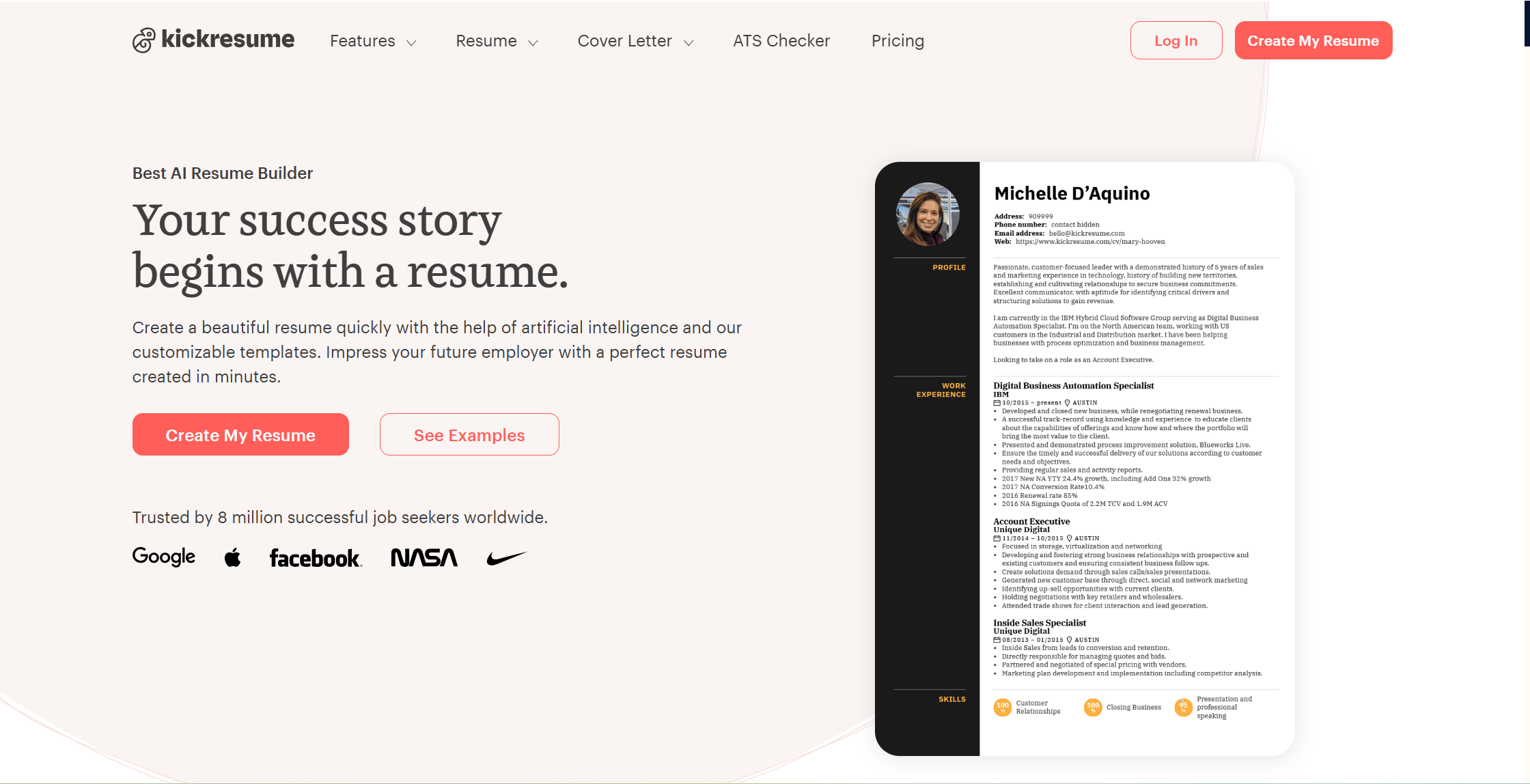 Kickresume 以多语言功能闻名,是一款面向国际化的免费简历设计网站。对于计划申请海外岗位的用户,是理想选择。