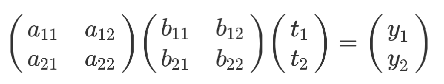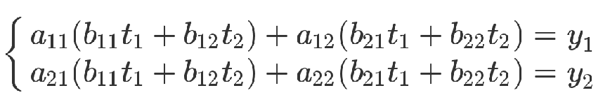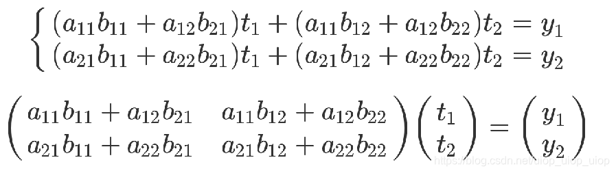 有了这两组方程式,就可以求 y 和 t 的关系。从矩阵来看,很显然,只要把第二个矩阵代入第一个矩阵即可。