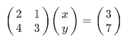 老实说,从上面这种写法,已经能看出矩阵乘法的规则了:系数矩阵第一行的2和1,各自与 x 和 y 的乘积之和,等于3。不过,这不算严格的证明,只是线性方程式转为矩阵的书写规则。