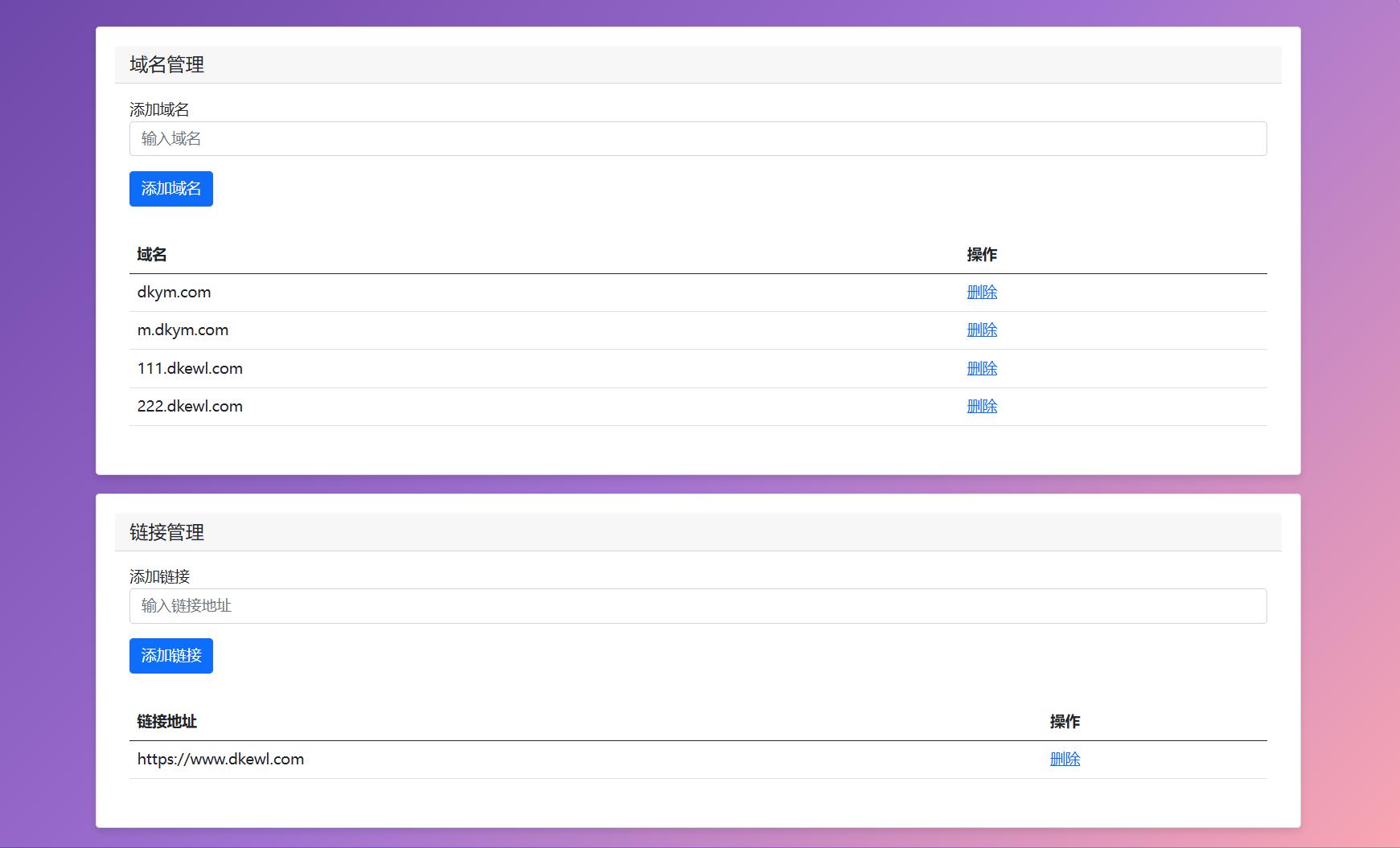 中转域名和需要跳转显示的域名在后台添加,如果是在微信推广,中转还有跳转显示的域名都不能红,红了就打不开