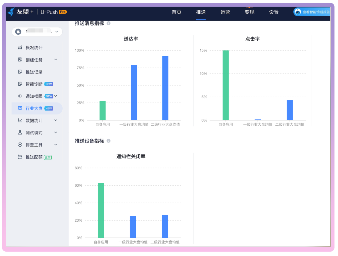 为帮助您全面评估推送效果,U-Push 在iOS端新增行业大盘对比能力。通过该功能,您可以: