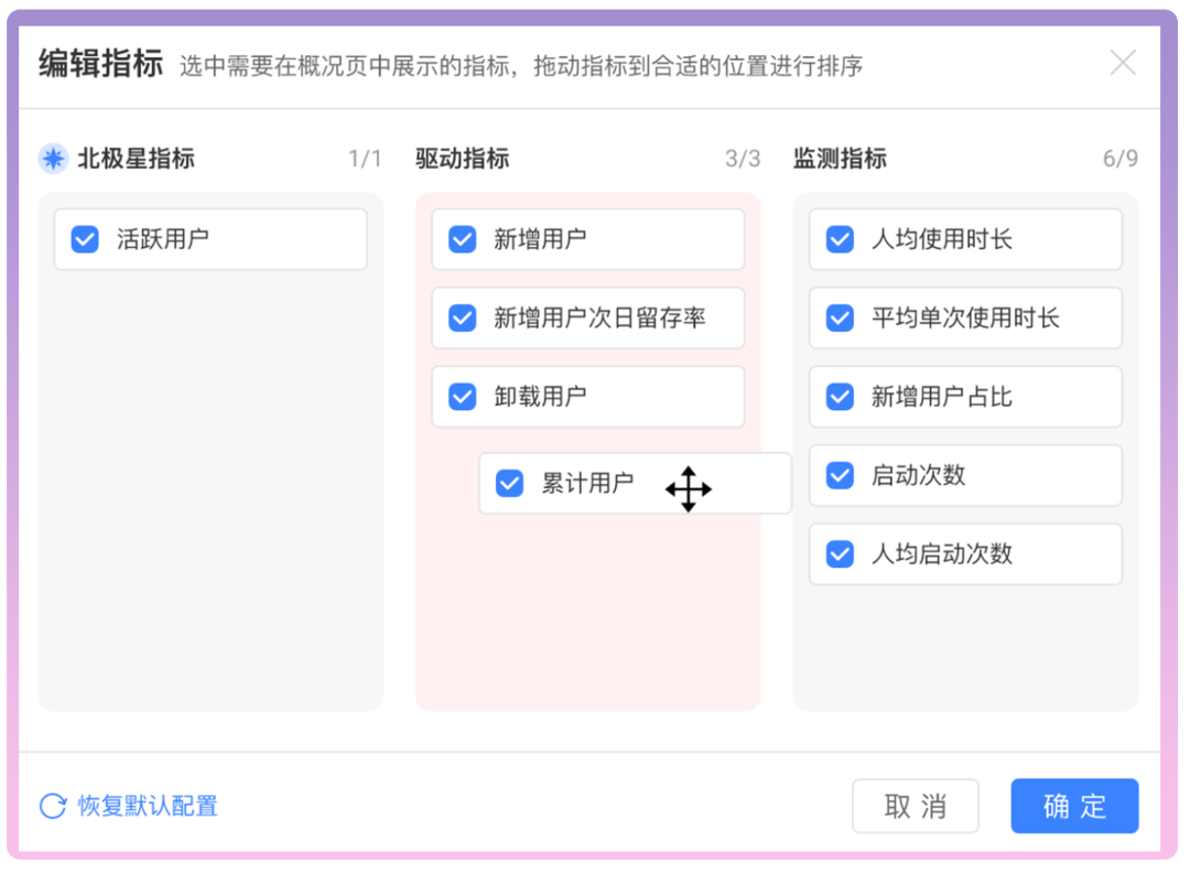 支持拖拽排序、指标编辑,自由调整看板上各项数据的布局与展示,以满足不同角色(如管理、运营、产品等)对数据关注点的差异化需求。