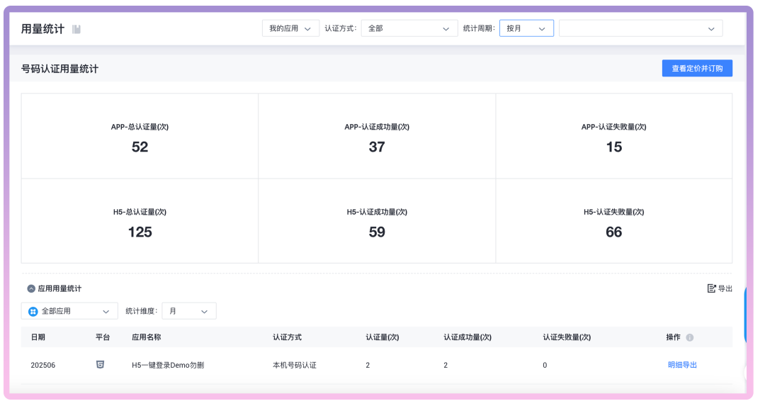 新增用量统计的整体看板和列表明细,支持查询最近6个月内,任意指定时间段内的号码认证服务请求量。