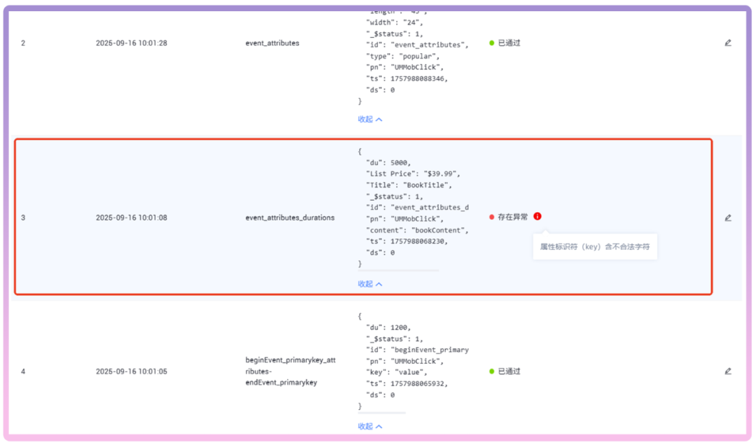 自动校验测试上报的事件。对于存在问题的事件,将标记为「存在异常」并直接提示具体的错误原因,以便快速定位并修复埋点错误。