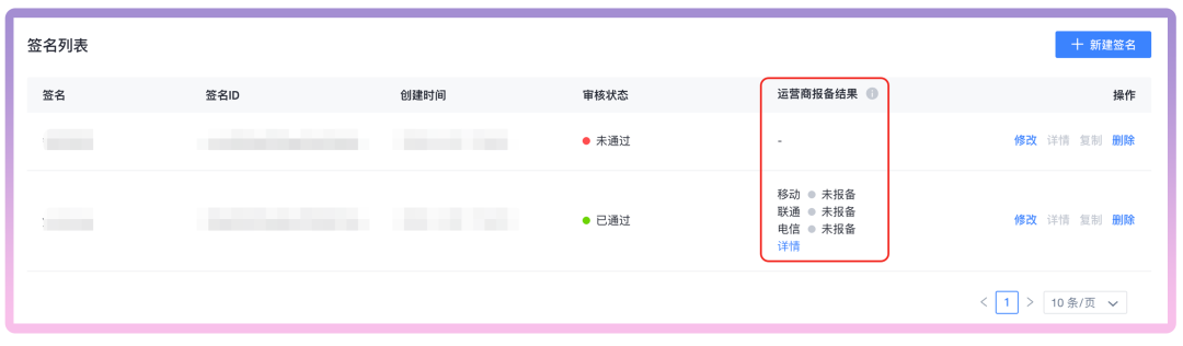 3.1 签名管理新增运营商报备结果,清晰标注当前报备状态,失败原因和操作建议,助力用户快速定位并解决报备环节中的问题。建议您尽快完成各运营商的签名报备工作,避免因报备未完成影响短信发送率。