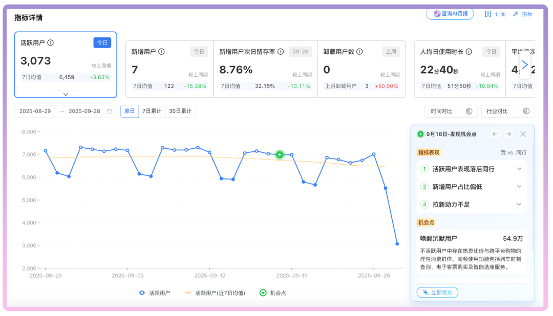 将建议转化为可量化、可行动的增长机会。例如,系统会直接指出“唤醒沉默用户 54.9万”,让优化目标清晰可见。