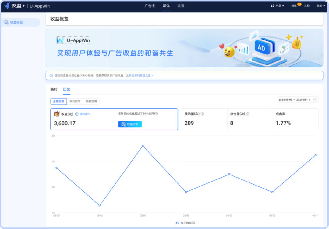 第三步:持续分析并优化收益表现。U-AppWin支持首页实时展示,涵盖当日收益、展示效果等关键指标,同时,系统还支持多维收益分析及行业对标功能,帮助判断媒体主收益健康度,从而持续调整策略、挖掘每一份流量的潜在价值。