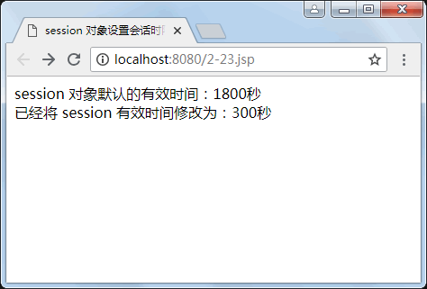 <%@ page language="java" pageEncoding="utf-8" %><html><head><title>session 对象设置会话时限</title></head><body>session 对象默认的有效时间:<%=session.getMaxInactiveInterval()%>秒<br><%session.setMaxInactiveInterval(60*5); //设置session的有效时间为5分钟%>已经将 session 有效时间修改为:<%=session.getMaxInactiveInterval()%>秒<br></body></html>