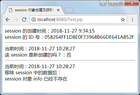 <%@ page language="java" import="java.util.*" pageEncoding="utf-8" %><html><head><title>session 对象创建及获取客户会话属性</title></head><body>session 的创建时间:<%=new Date(session.getCreationTime()).toLocaleString() %> <br>session 的 ID 号:<%=session.getId() %> <br> <hr>当前时间:<%=new Date().toLocaleString( ) %> <br>该 session 是新创建的吗?:<%=session.isNew()?"是":"否" %> <br> <hr>当前时间:<%=new Date().toLocaleString( ) %> <br>移除 session 中的数据后:<br><%session.removeAttribute("info");if(session.getAttribute("info")==null){out.println("session 对象 info 已经不存在");}else{out.println(session.getAttribute("info"));}%></body></html>