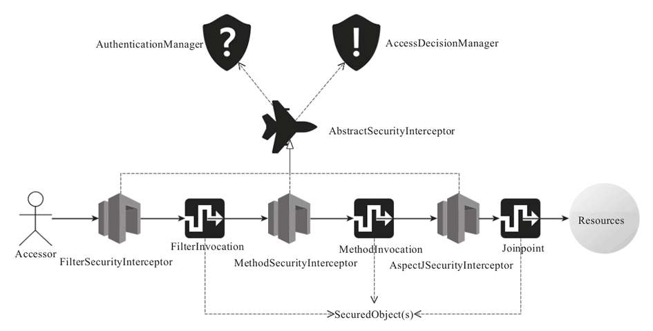 在访问资源的所经之路上,可能需要上山、过桥、下海行船,不管怎么样,这些所经之路对于我们要防护的资源来说都是比较好的设置关卡点,对应上图就是 FilterInvocation(对应 Web 应用场景)、MethodInvocation 以及 Joinpoint,这些在 Spring Security 框架中统称 Secured Object(s)。