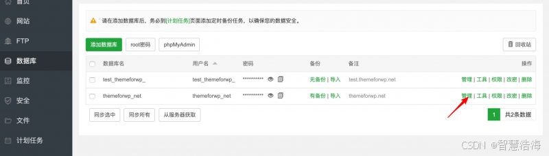 打开宝塔面板后台,选择数据库 – 管理