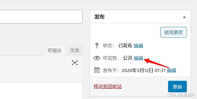 你需要先找到右侧的发布模块,其中有个选项叫做可见性,点击它旁边的编辑按钮