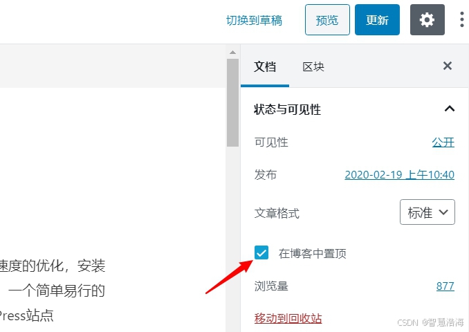 现在WordPress默认的编辑器已经是新版的古腾堡编辑器了,古腾堡中许多选项设置都更方便了,其中改进明显的一项就是置顶文章,只需要在右侧的文档设置中勾选”在博客中置顶选项“,即可置顶文章